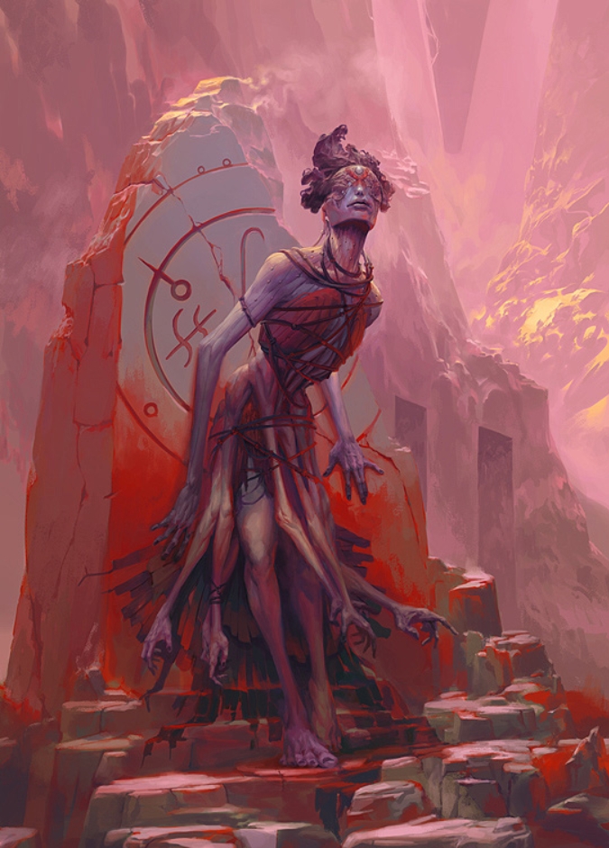 A truly cruel mistress, Taedra uses demons to torment the people of Remorra. Her most well known demon, Gaasiht the Harvester, pilots “The Harrow“, a roughly 1-mile diameter floating object that is used to collect souls for Taedra to torture.