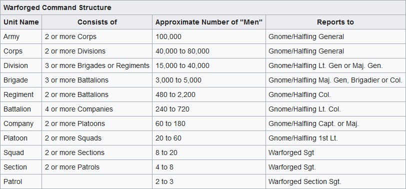 In both times of war and peace, each unit or battalion reports to a gnome or halfling leader as shown below: